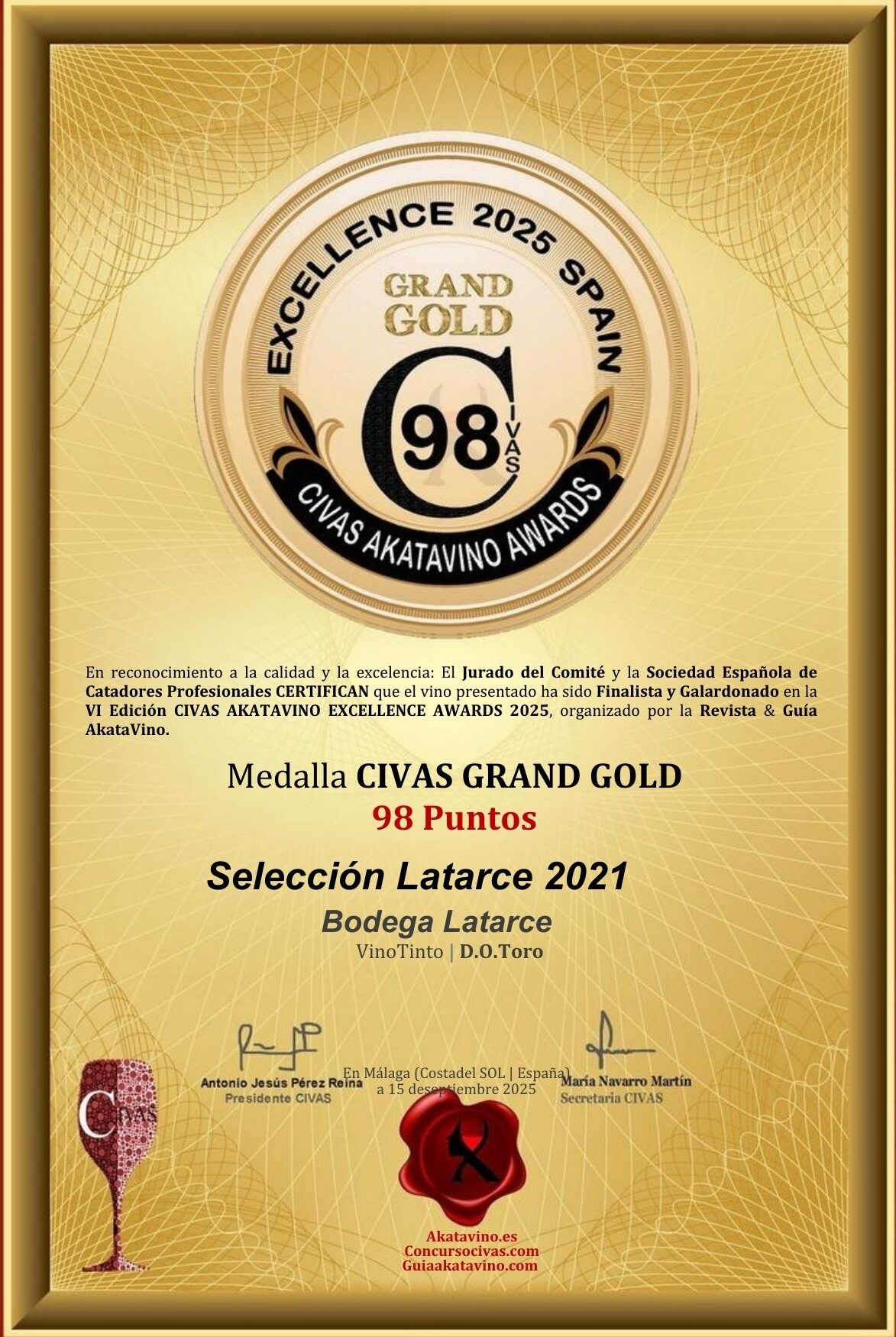 El vino Latarce Selección 2021, de la Bodega Latarce (D.O. Toro), está de celebración: ¡se ha llevado la medalla Grand Gold en el prestigioso concurso internacional Civas 2025! Un certamen de primer nivel, famoso por la exigencia de sus catas a ciegas, donde solo brillan los mejores.